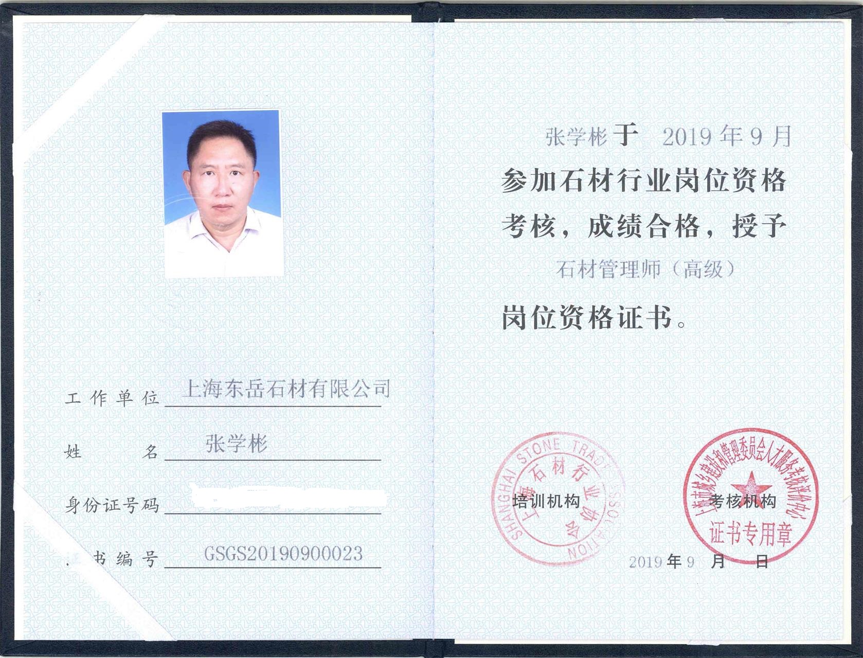 8月9日至12日,由上海市石材行業(yè)協(xié)會(huì)和上海市城市建設(shè)和管理委員會(huì)人才服務(wù)考核評(píng)價(jià)中心聯(lián)合舉辦的高級(jí)石材管理師培訓(xùn),經(jīng)過(guò)3天的緊張學(xué)習(xí)和后續(xù)網(wǎng)絡(luò)視頻教學(xué),主要學(xué)習(xí)了石材分類和特性、石材加工、石材安裝、石材防護(hù)方面的知識(shí),也參觀了金石獎(jiǎng)優(yōu)秀石材工程-復(fù)旦大學(xué)江灣校區(qū)體育館項(xiàng)目,進(jìn)行了石材企業(yè)經(jīng)驗(yàn)分享和經(jīng)營(yíng)管理交流互動(dòng)。上海東岳委派人員張學(xué)彬培訓(xùn)合格并取得相應(yīng)證書。